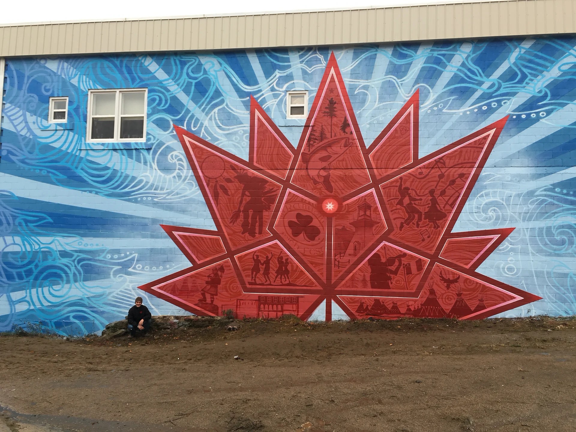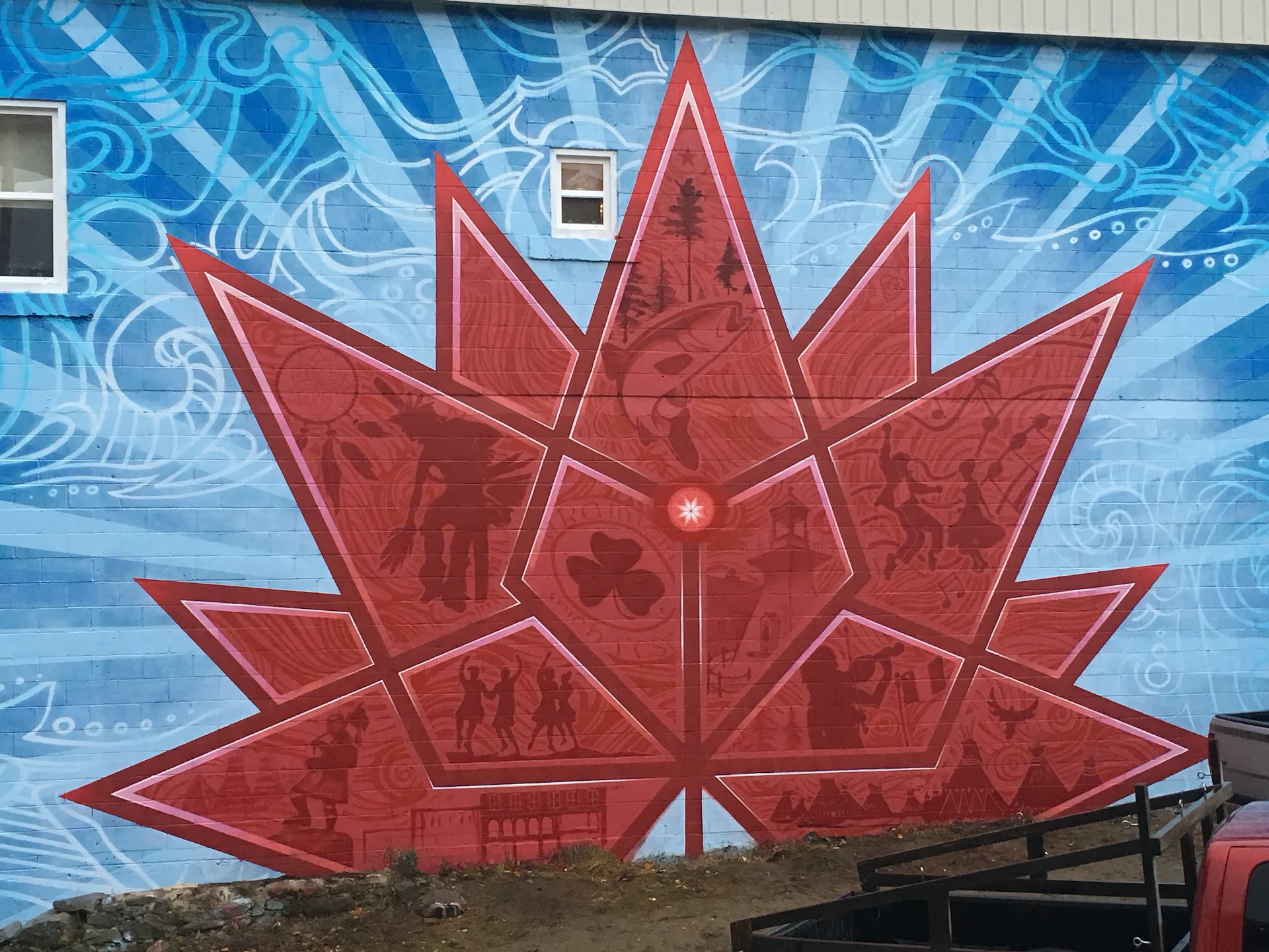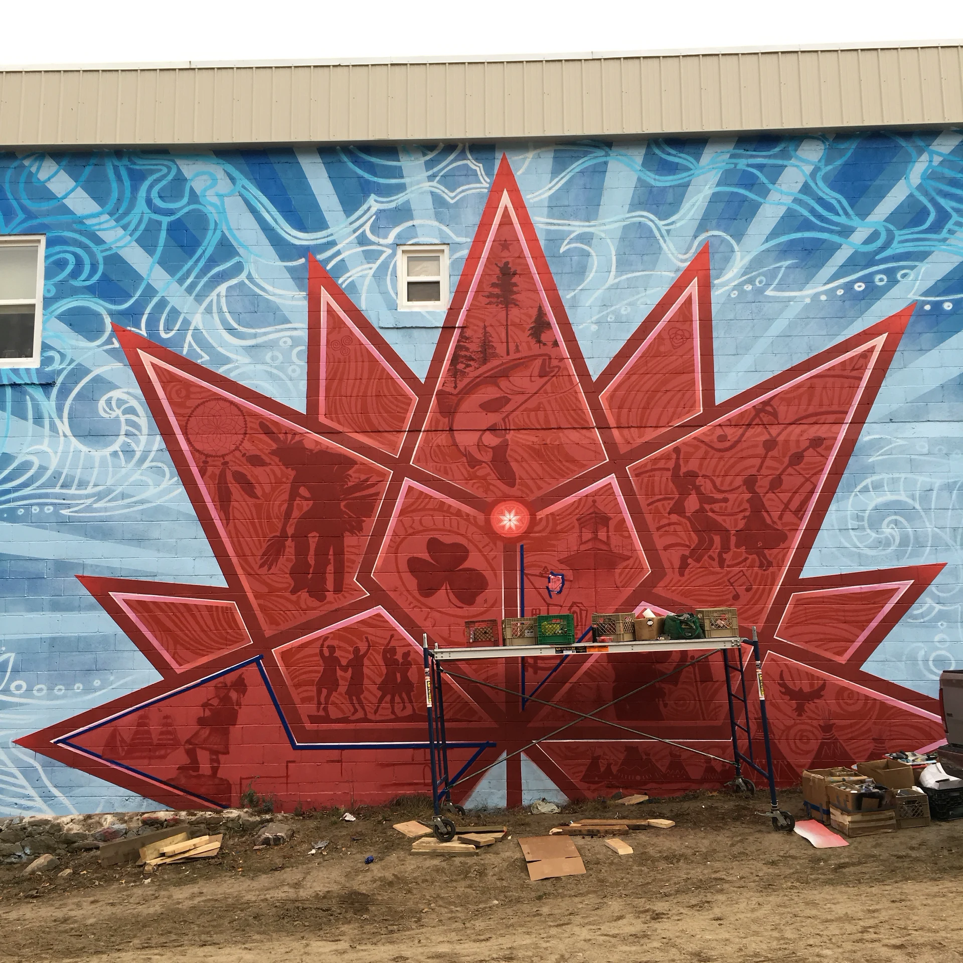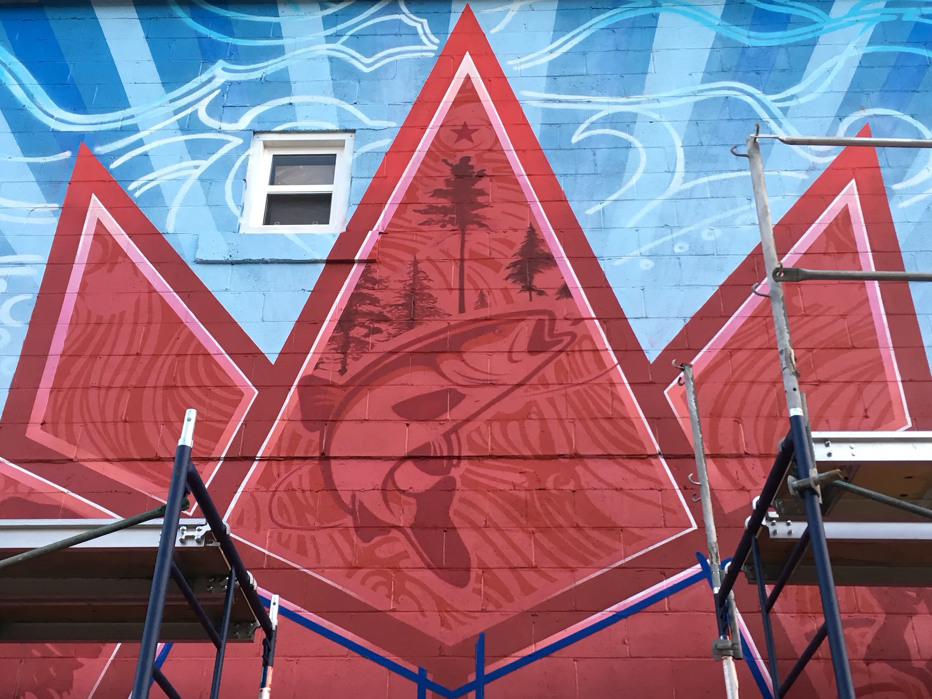 Downtown Miramichi New Brunswick Mural designed by Loogaroo & painted by Christian Toth as part of ‘Canada 150’, Canada’s 150 year founding celebration. A mix of federal, provincial, and municipal funding allowed the creative project to come to fruition. Dimensions; 66ft. (W) x 32ft. (H)