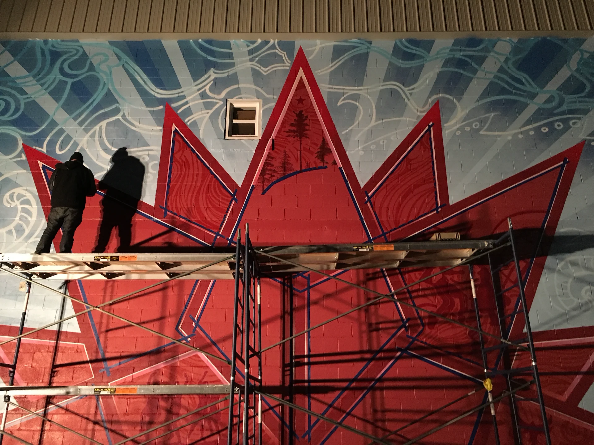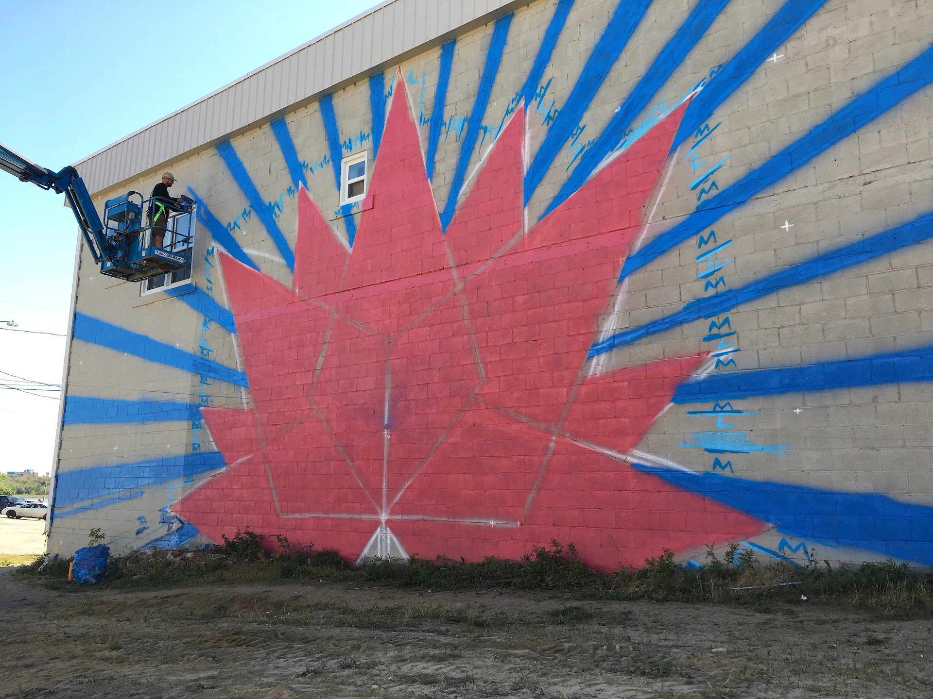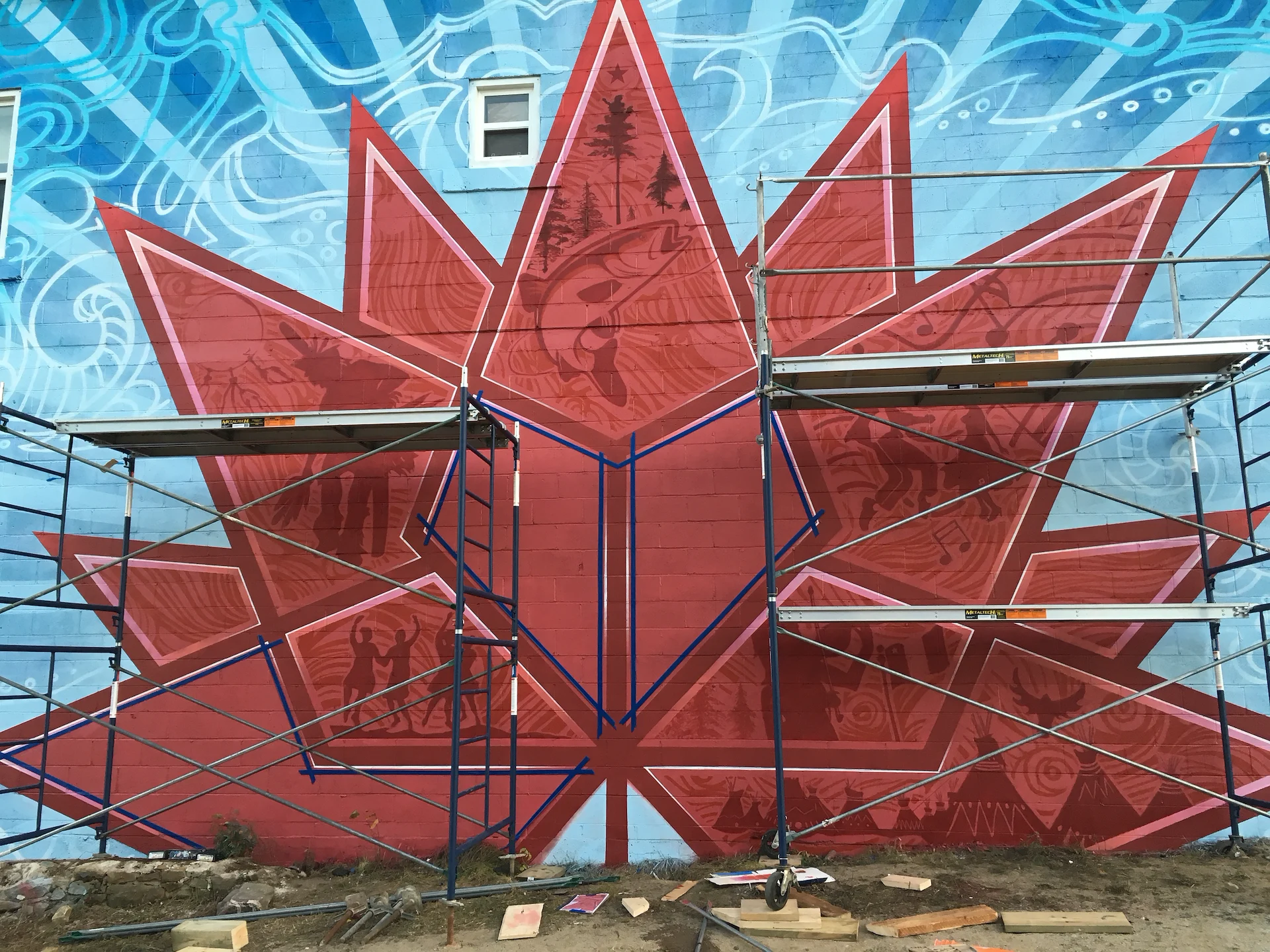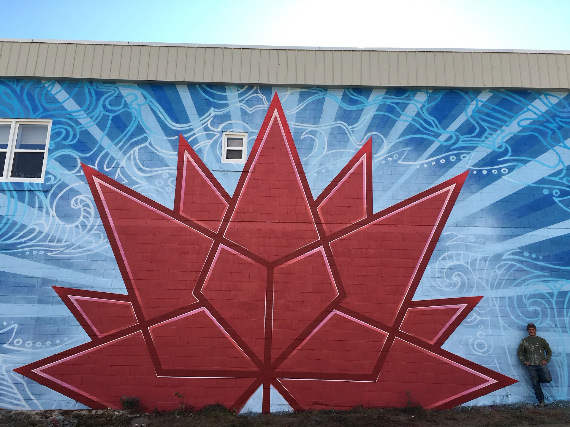 Downtown Miramichi New Brunswick Mural designed by Loogaroo & painted by Christian Toth as part of ‘Canada 150’, Canada’s 150 year founding celebration. A mix of federal, provincial, and municipal funding allowed the creative project to come to fruition. Dimensions; 66ft. (W) x 32ft. (H)