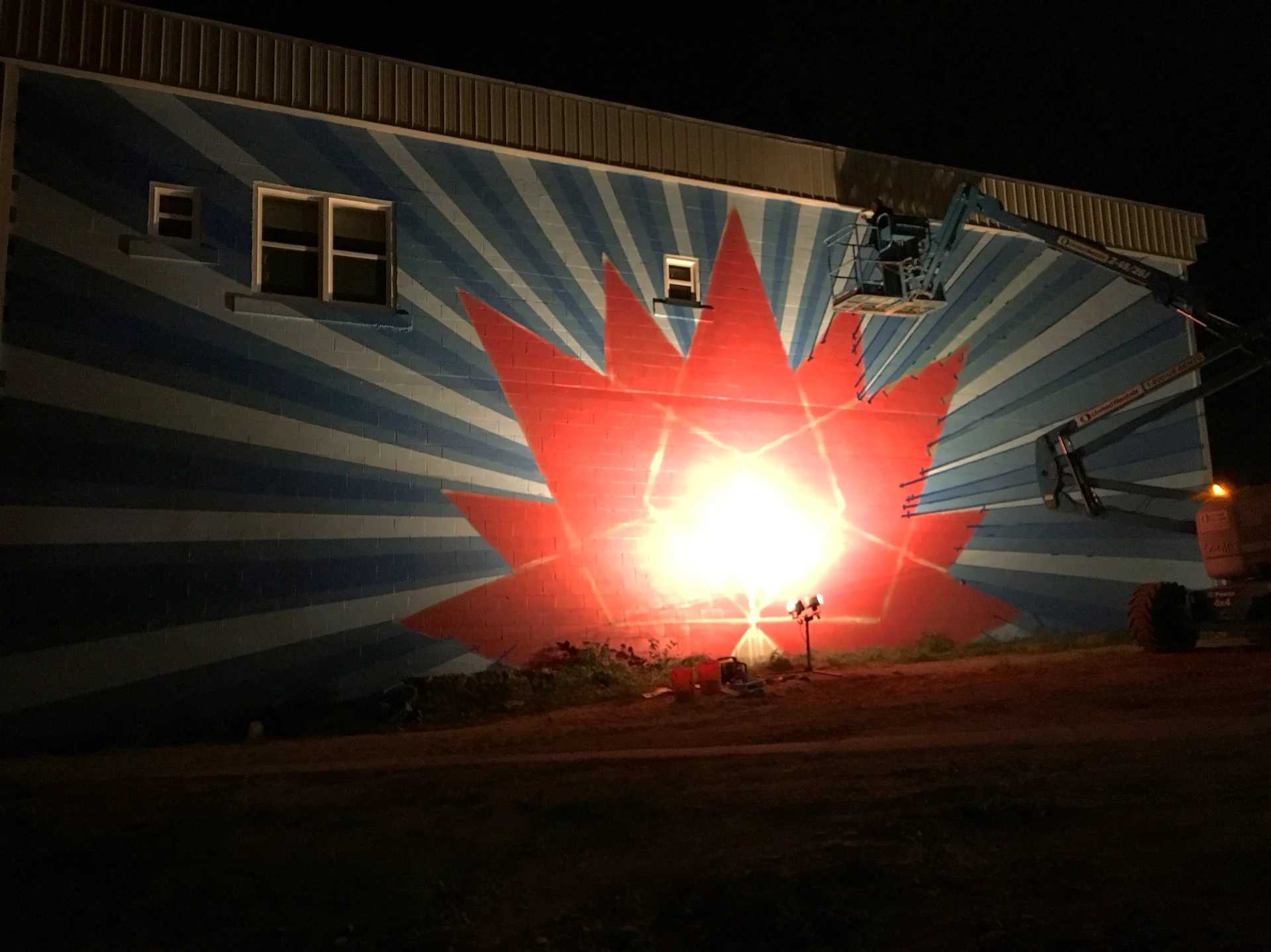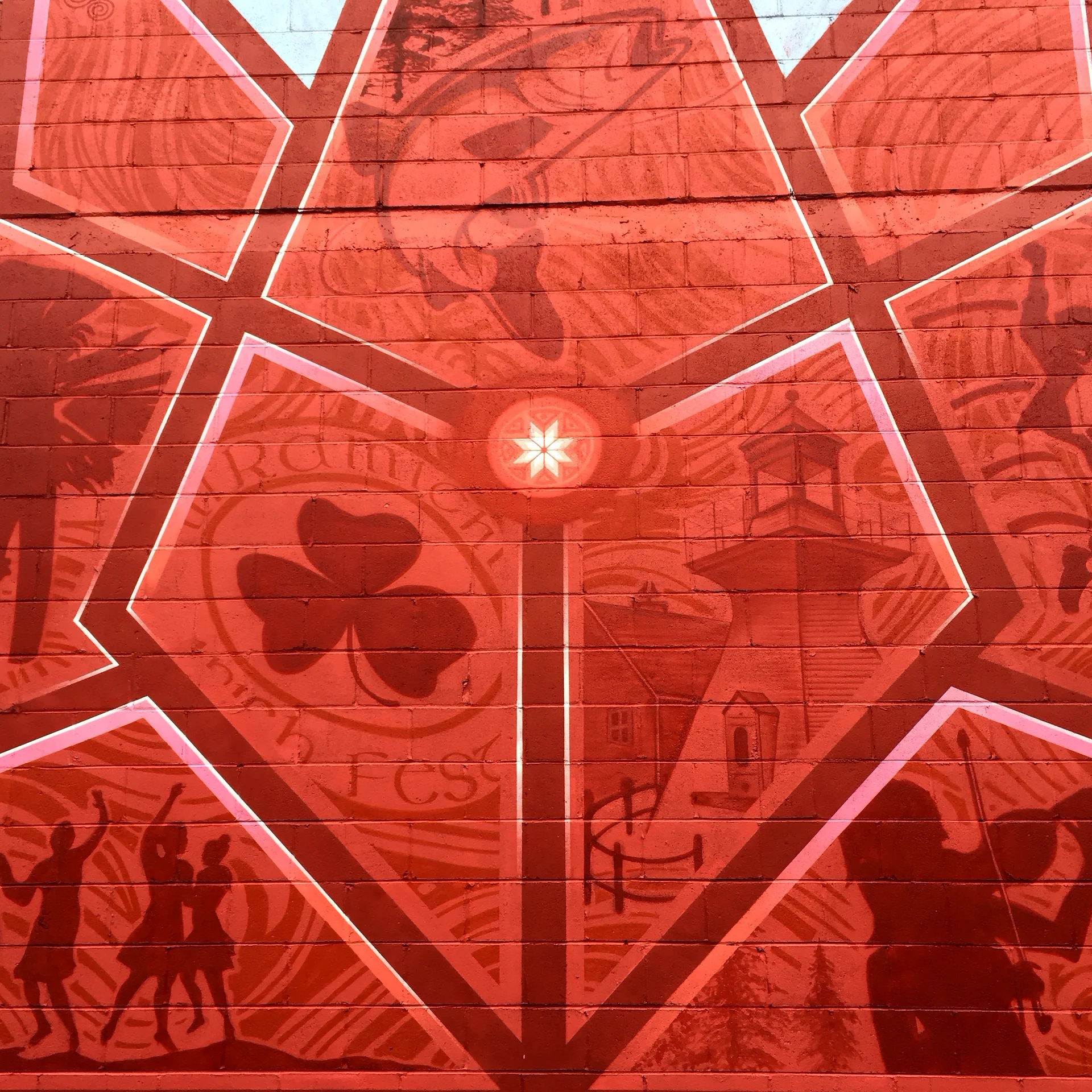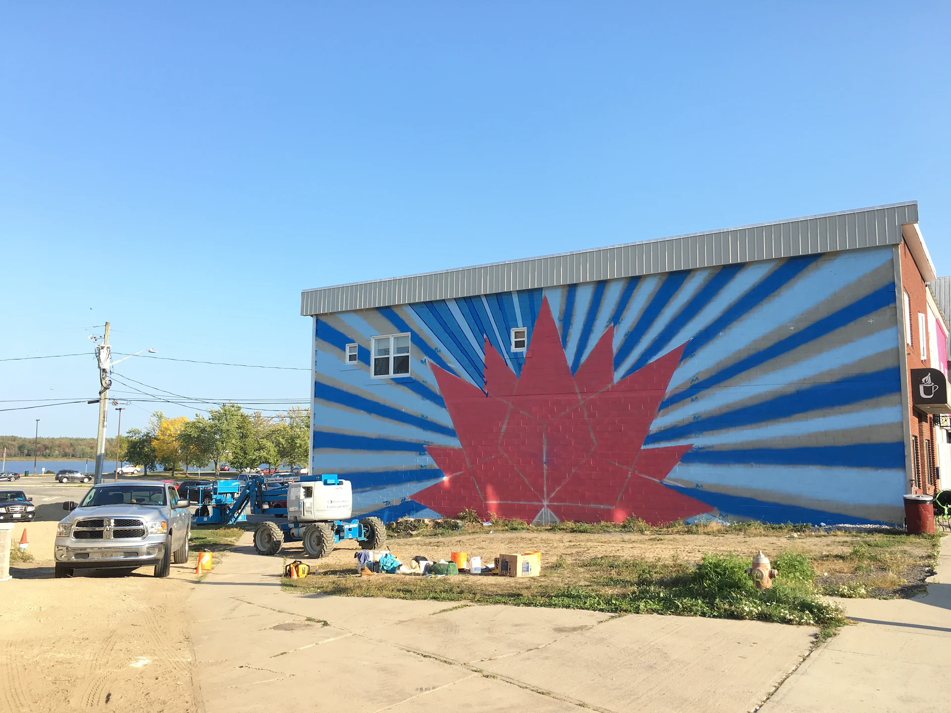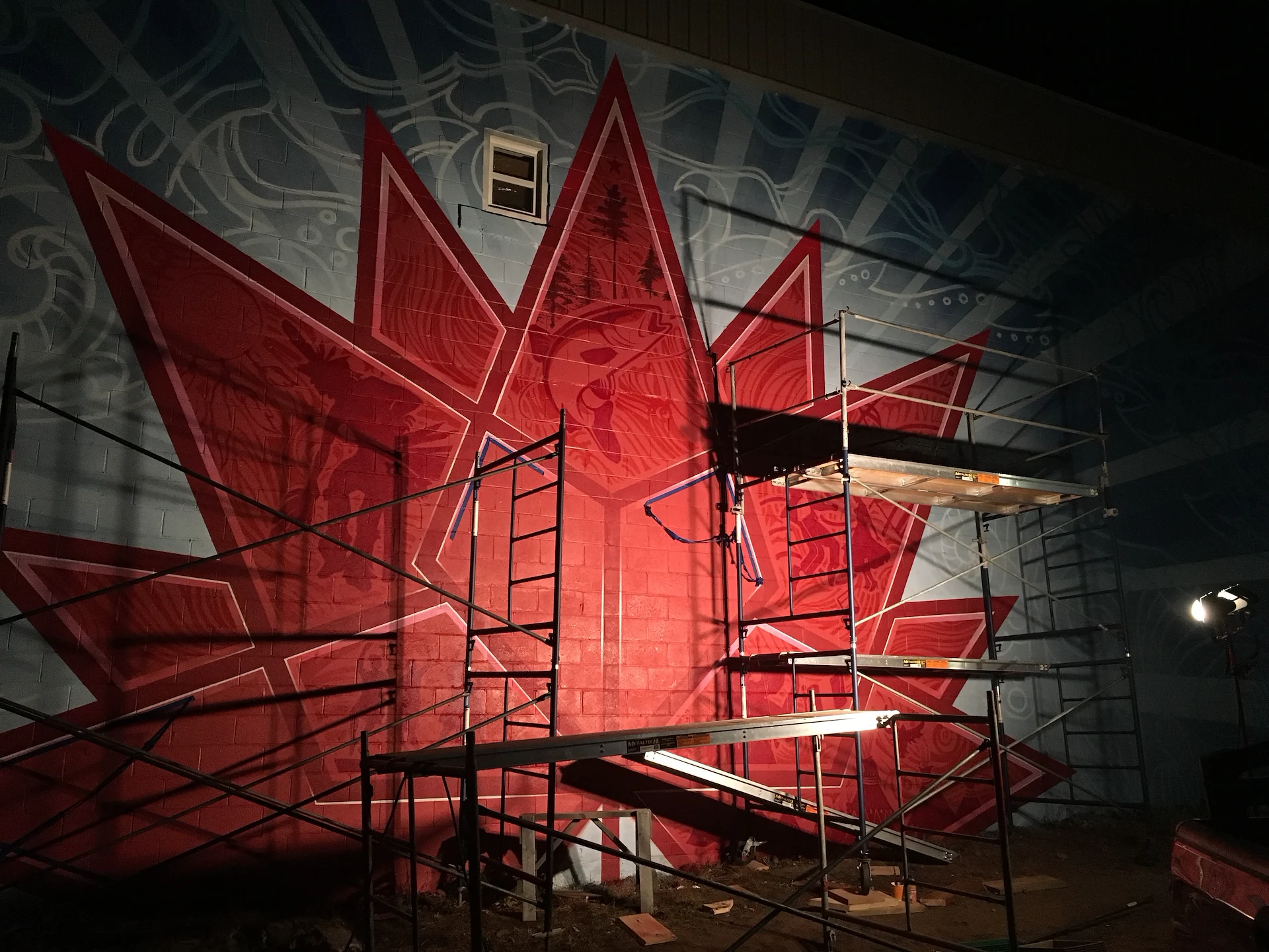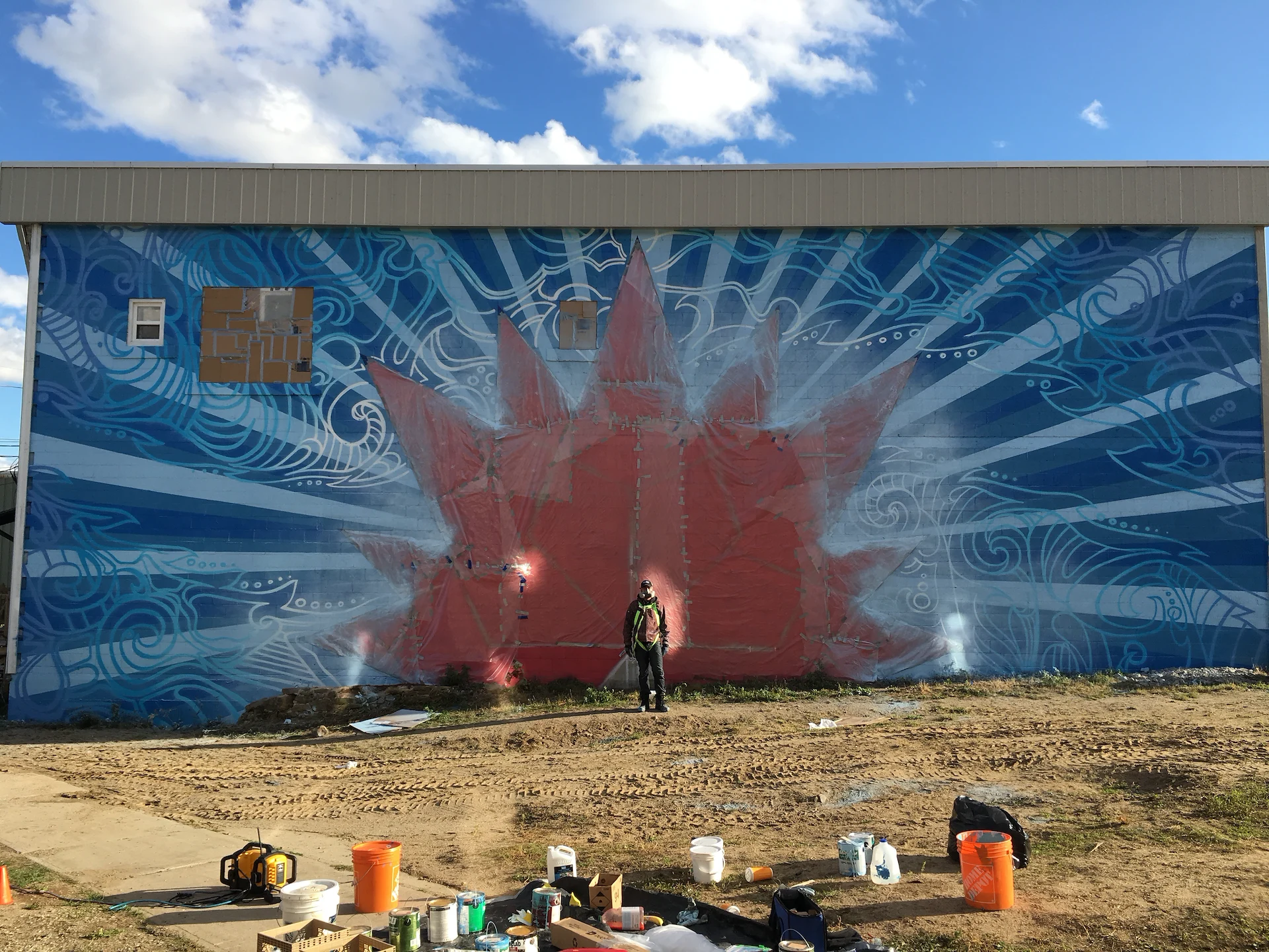 Downtown Miramichi New Brunswick Mural designed by Loogaroo & painted by Christian Toth as part of ‘Canada 150’, Canada’s 150 year founding celebration. A mix of federal, provincial, and municipal funding allowed the creative project to come to fruition. Dimensions; 66ft. (W) x 32ft. (H)