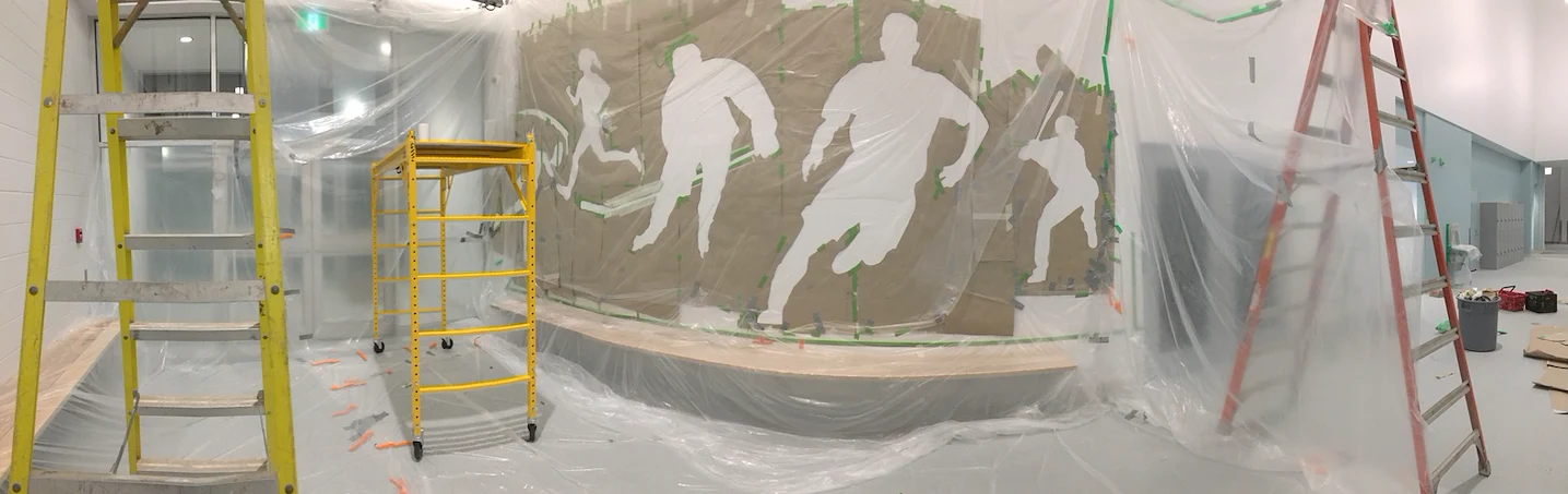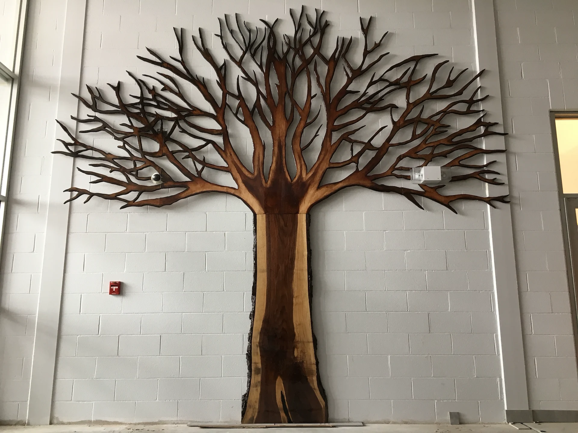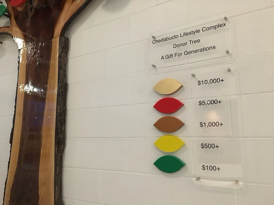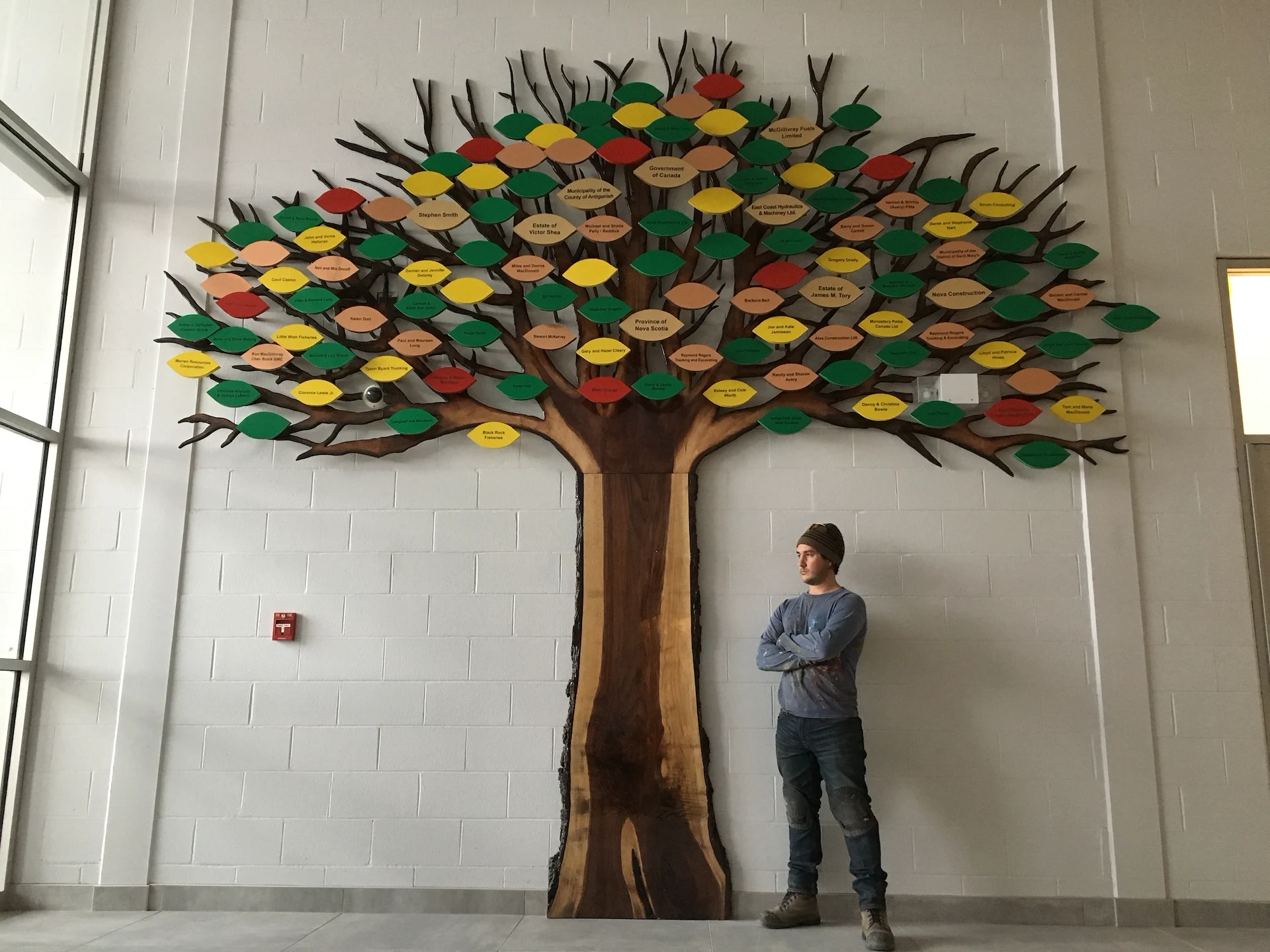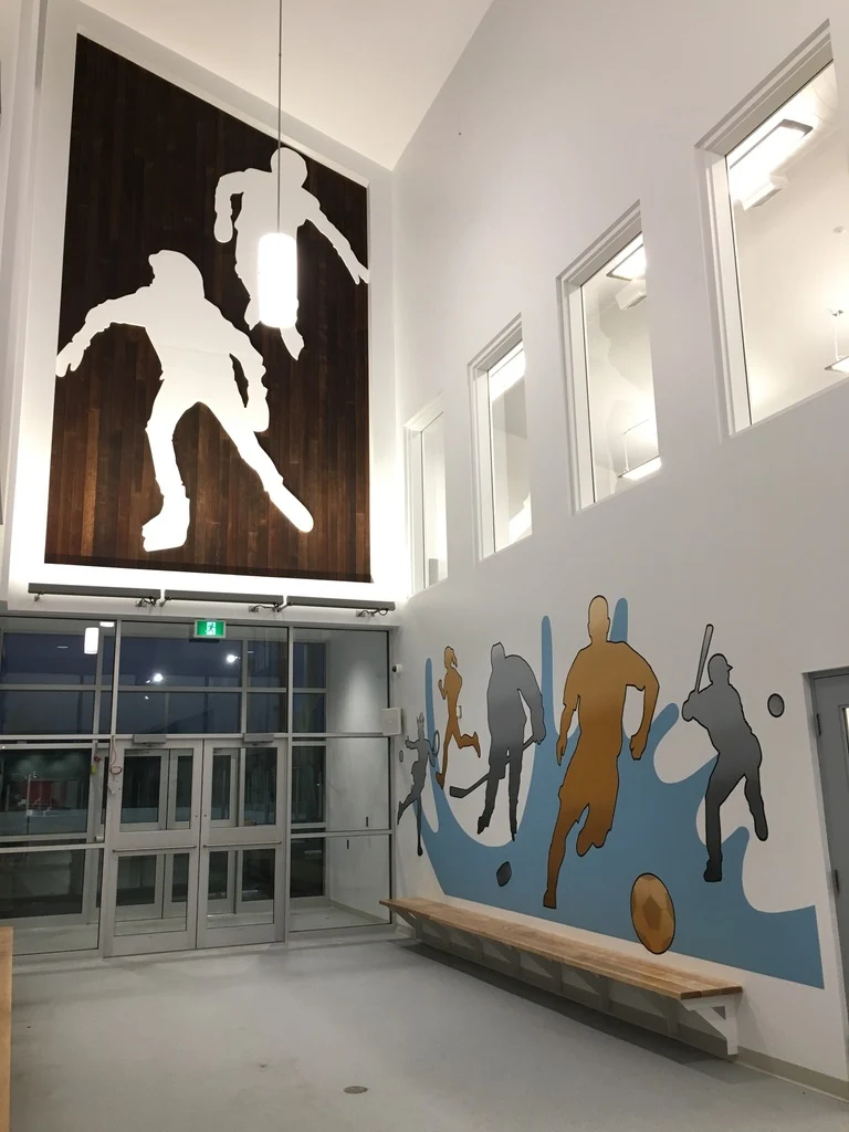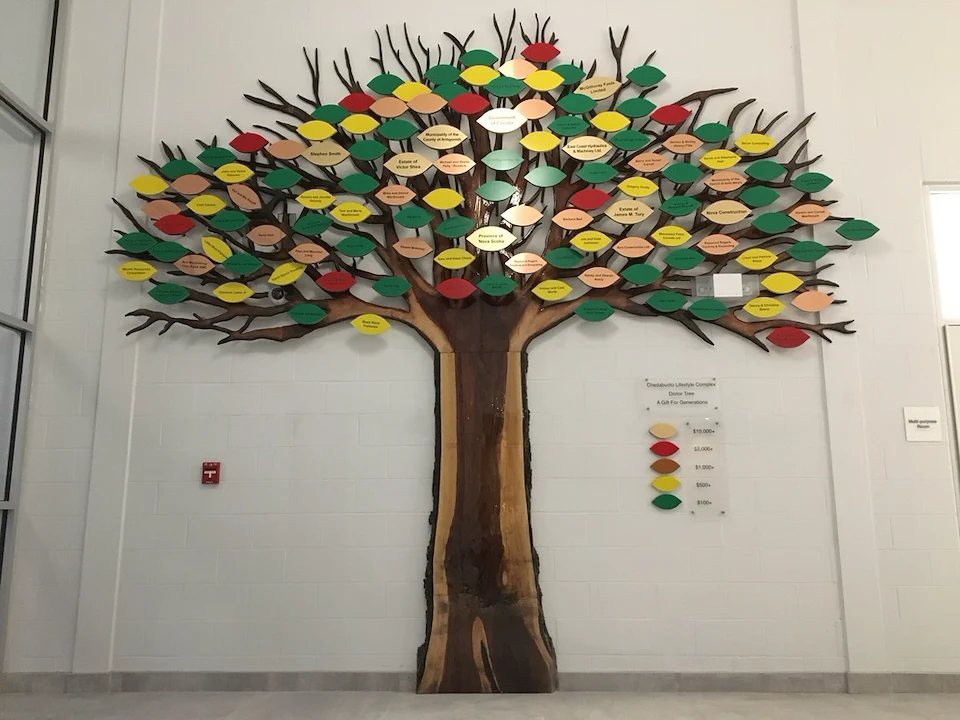 Live edge donor tree sculpture, large scale mural, and various related sub components for the new build state of the art Chedabucto Lifestyle Complex in Guysborough Nova Scotia, Canada.