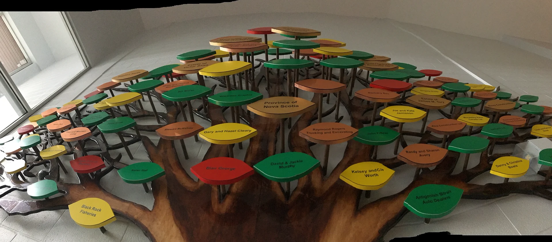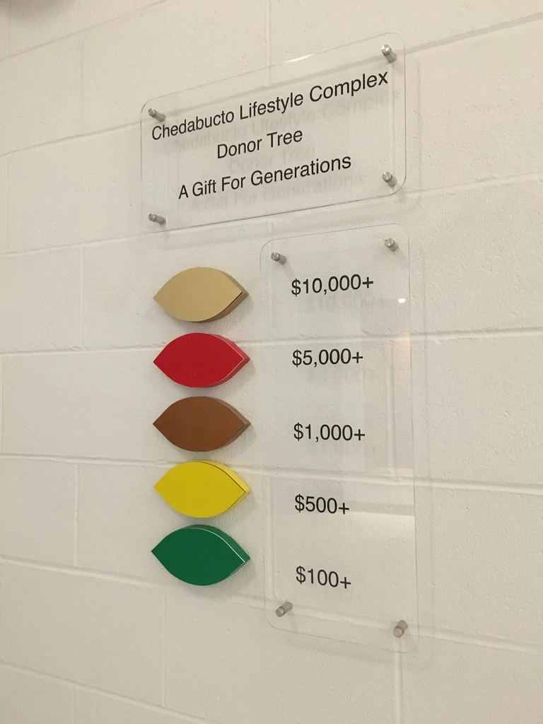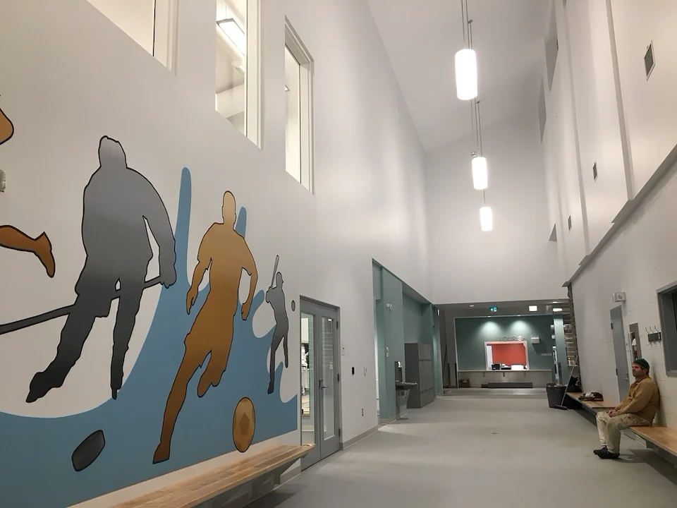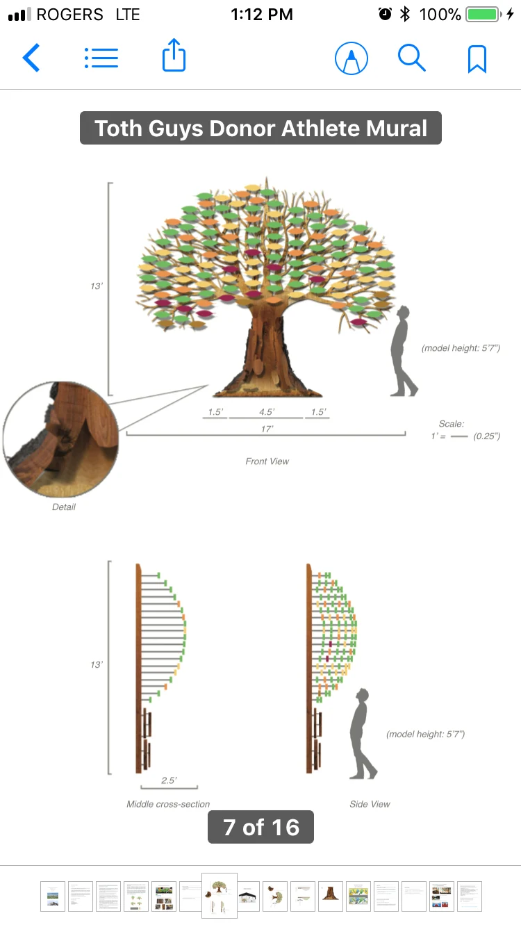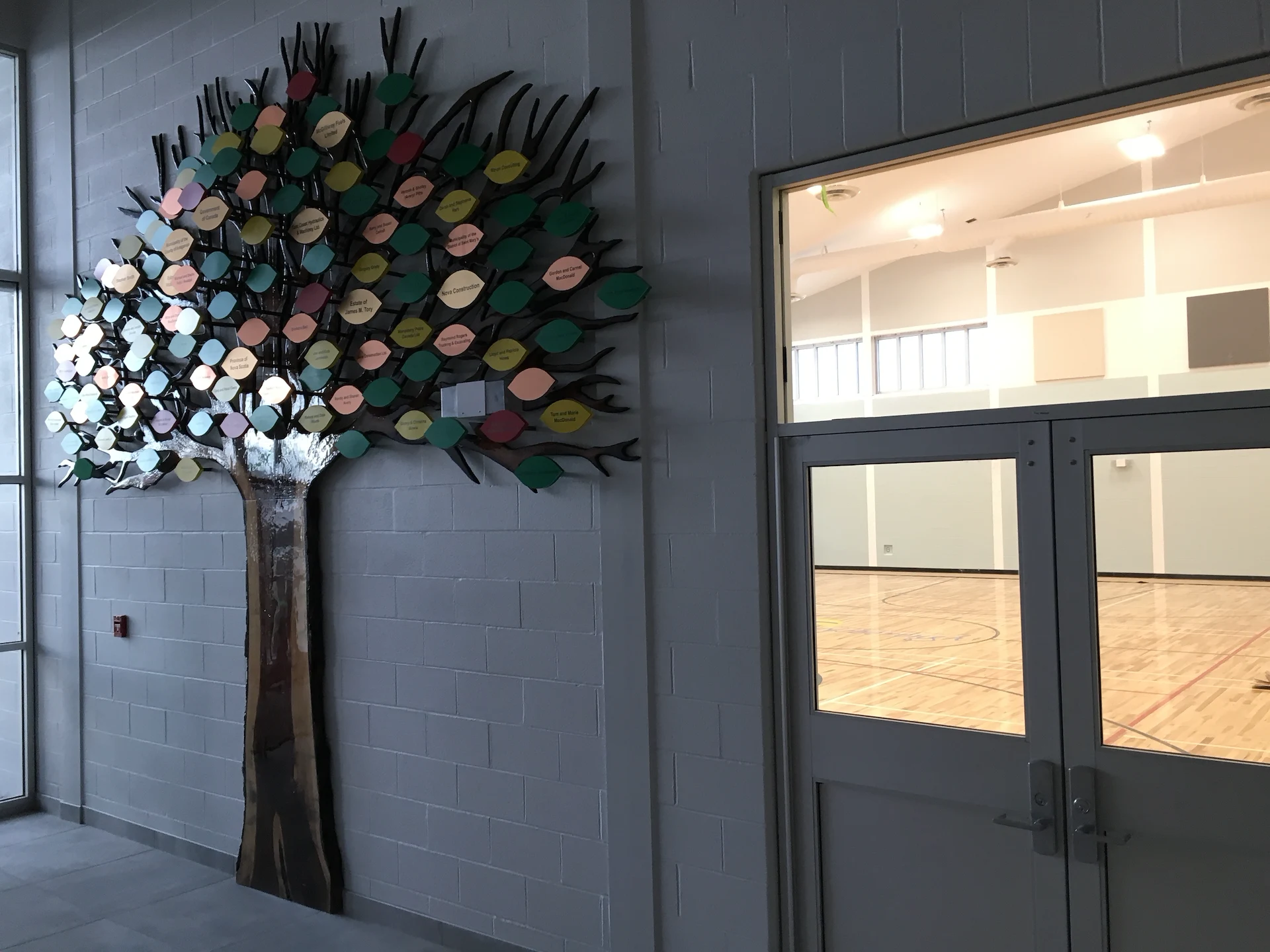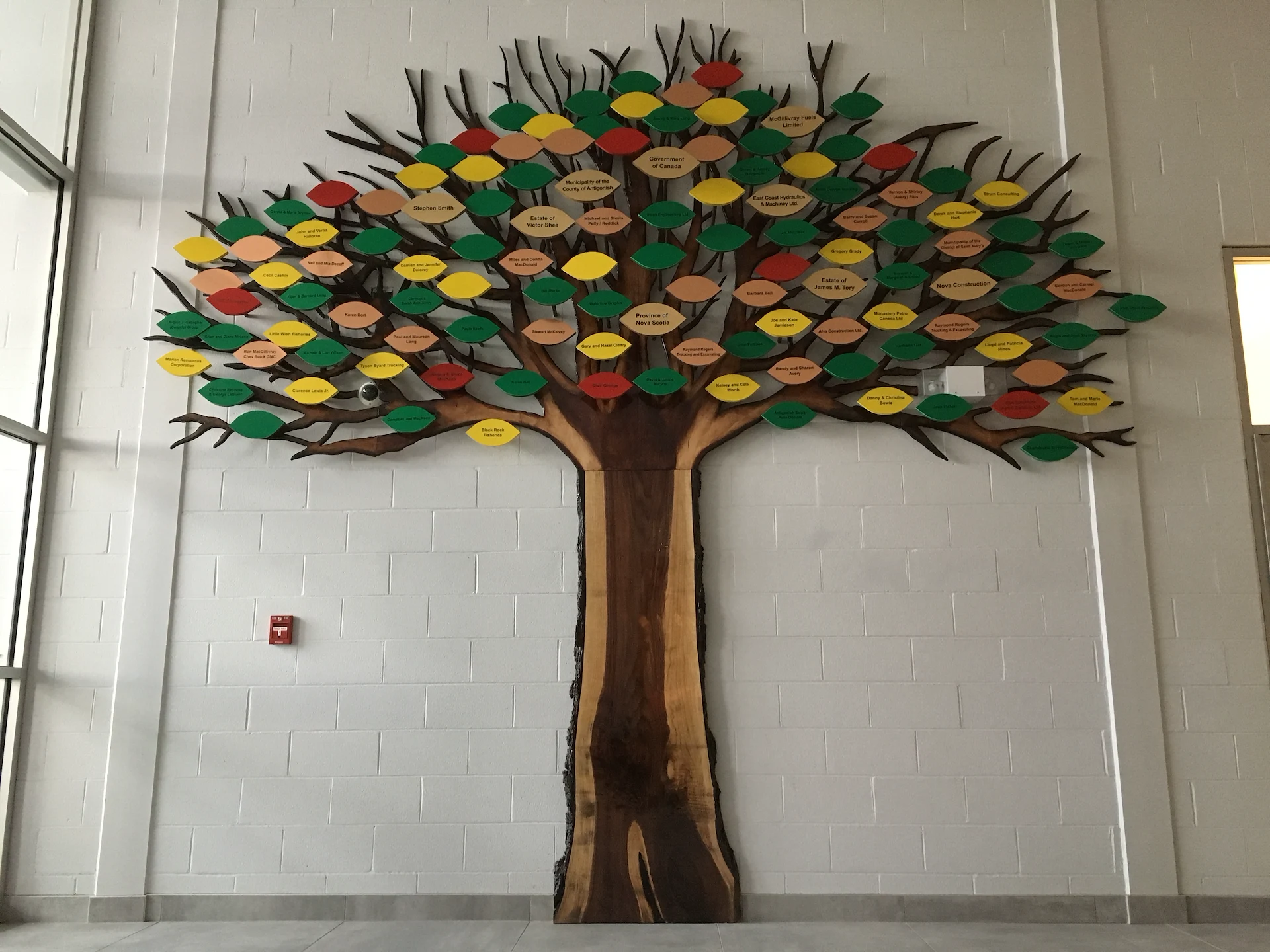 Live edge donor tree sculpture, large scale mural, and various related sub components for the new build state of the art Chedabucto Lifestyle Complex in Guysborough Nova Scotia, Canada.
