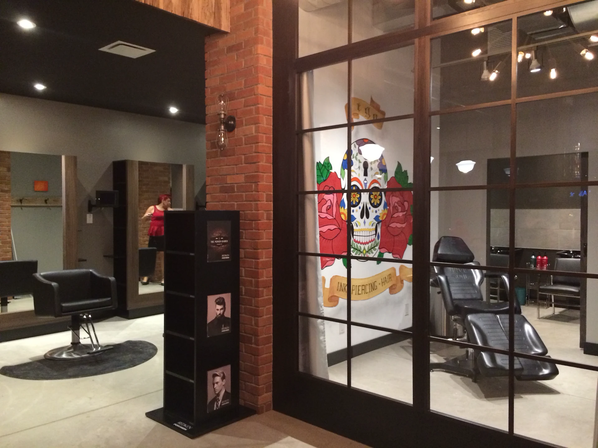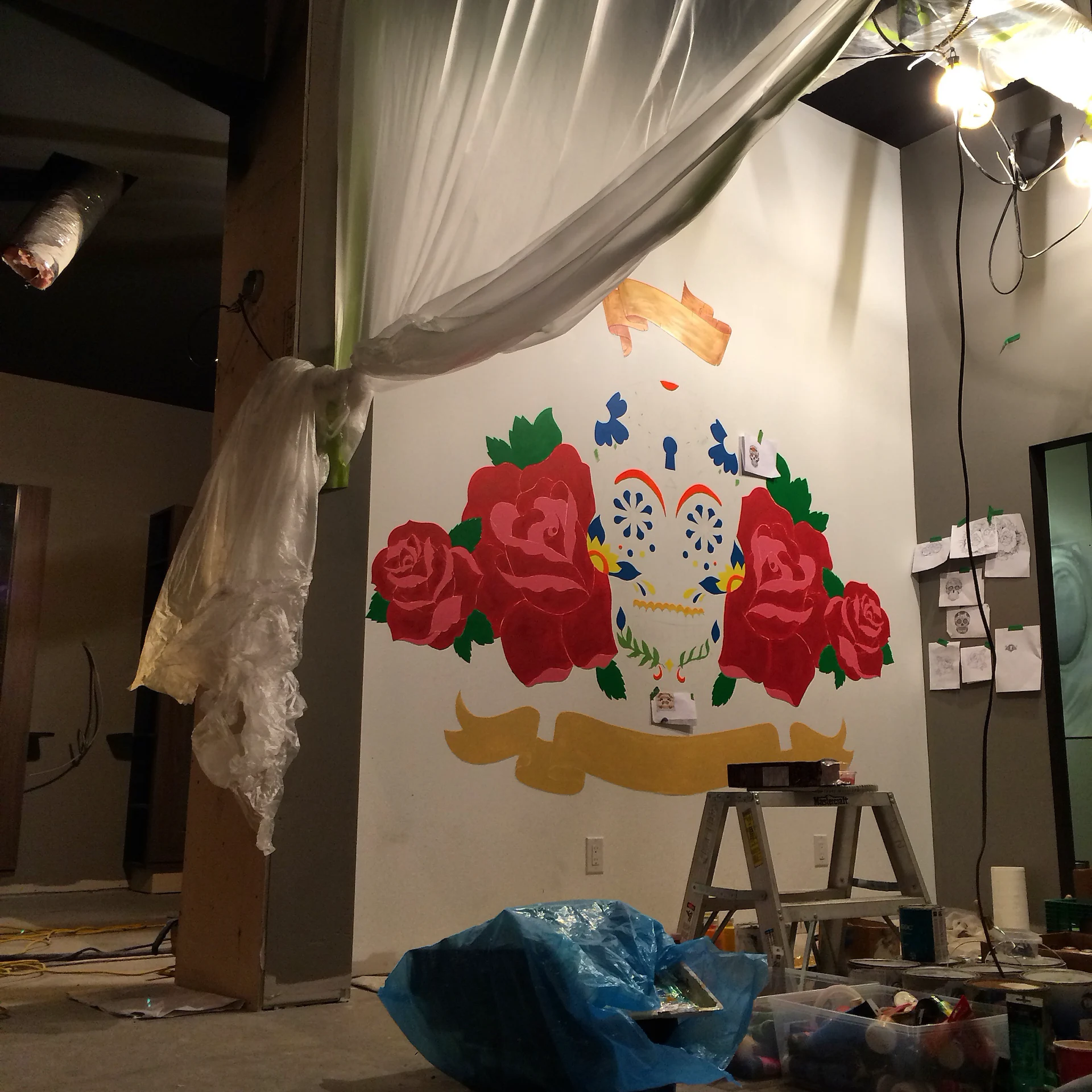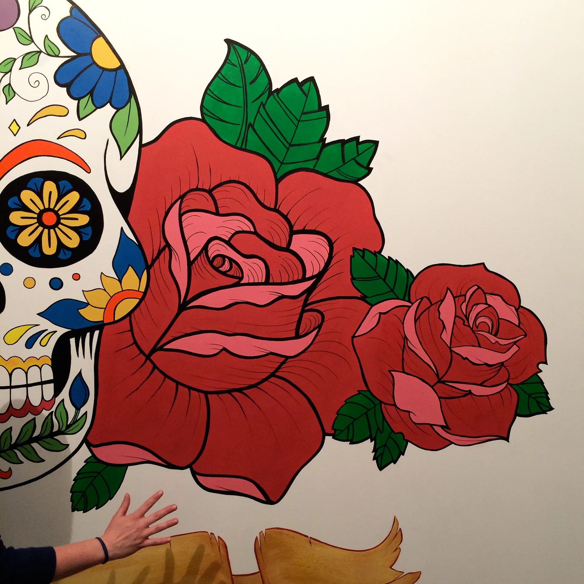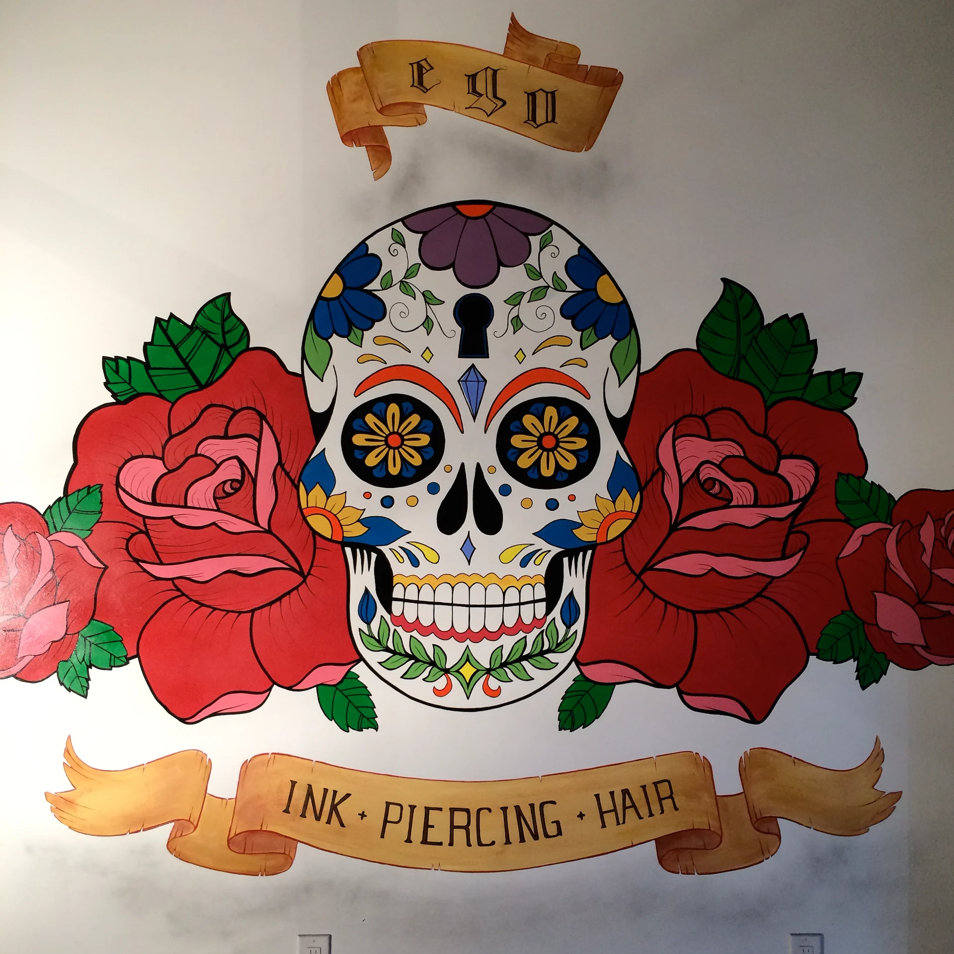Ego Studio was searching for a multi faceted artist to deliver their unique large installations including a 15ftx20ft 3D lettering mural, a 15ftx15ft custom designed classic sugar skull tattoo style installation, and other design elements to represent each area of the companies unique approach of operating tattooing, piercings, hair, and barber services under one style house. Christian was recommended for the custom diverse art delivery and through in depth consultation the following is what was created during the commercial build of the studio along with custom paintings. Interior design & layout by Spitfire Design & commercial build by The Oakland Group.