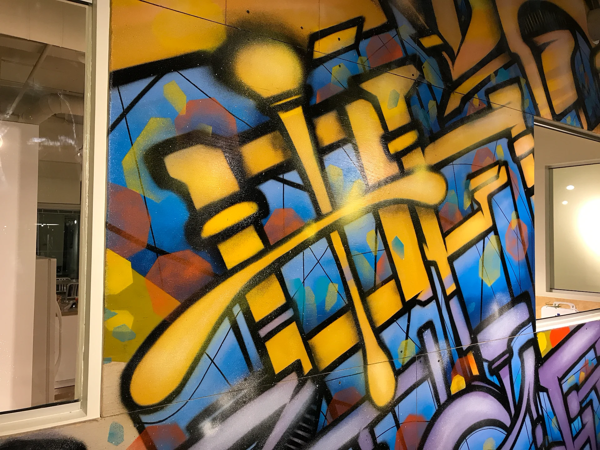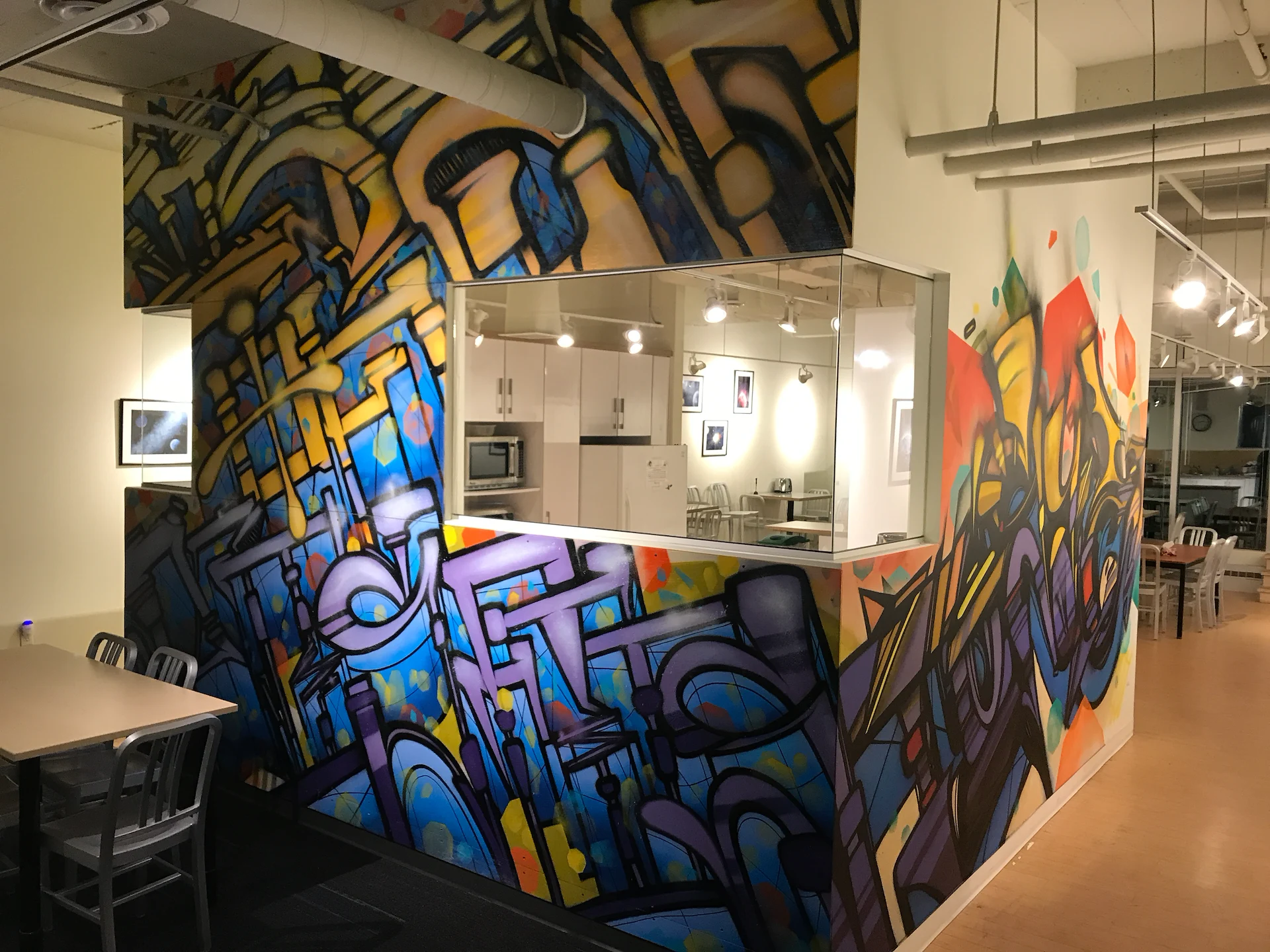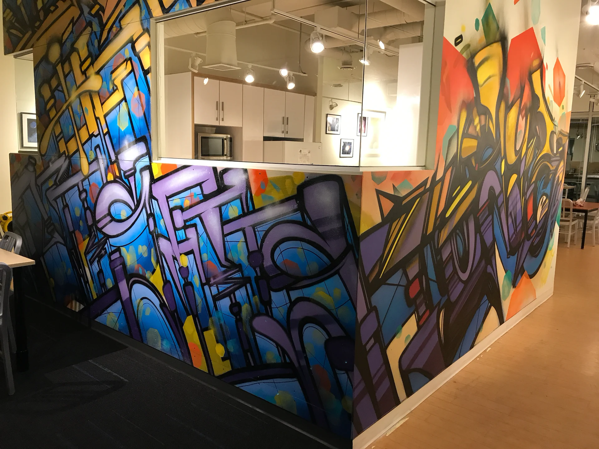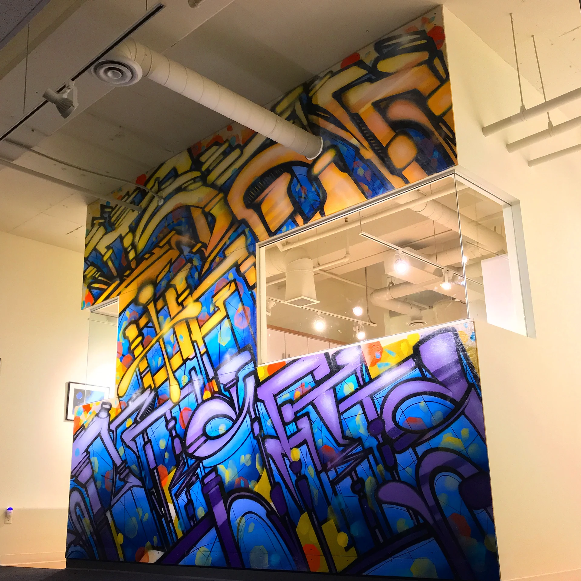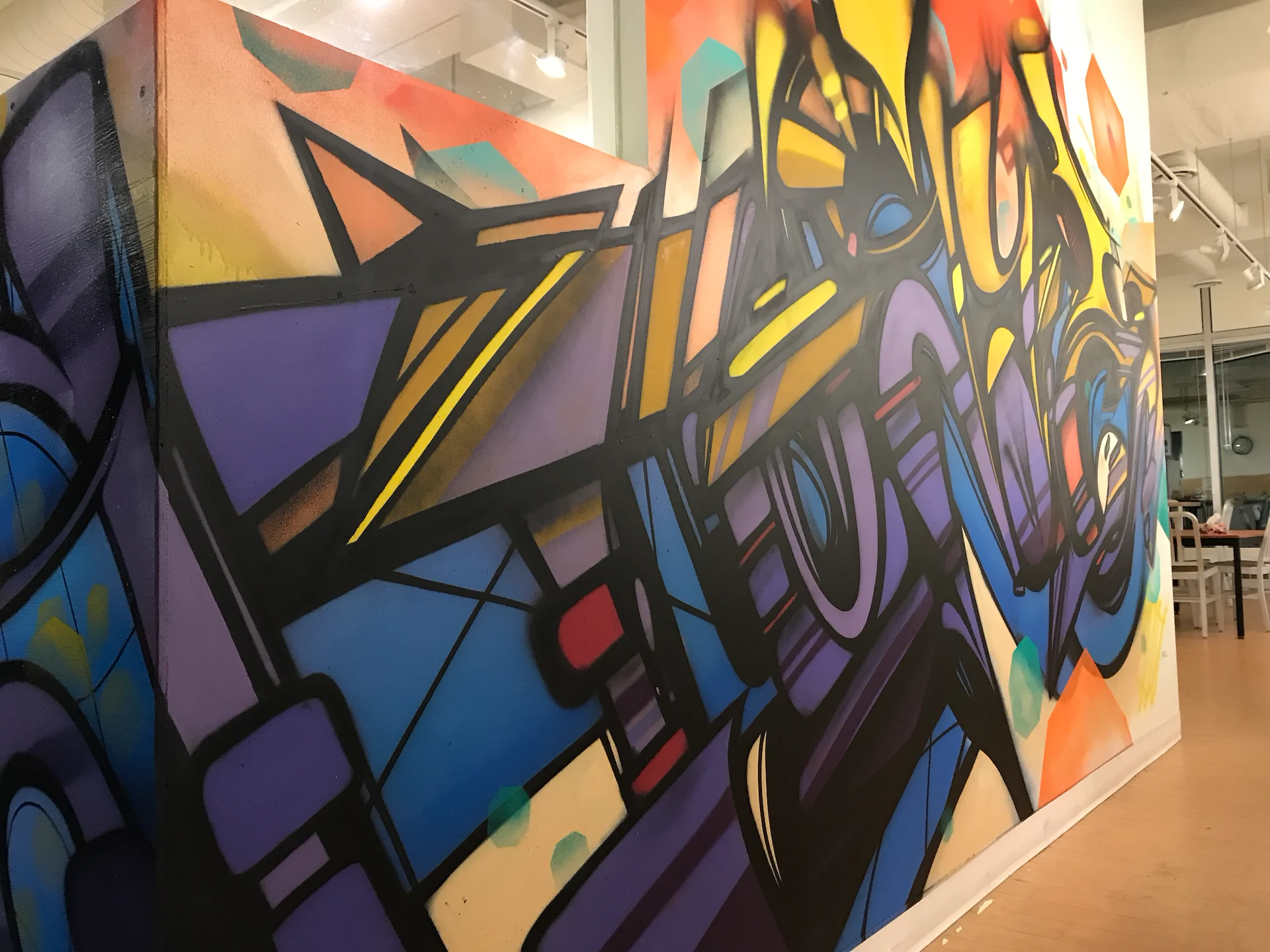 Custom art paneling was painted & installed with an urban art graffiti mural ‘Island Of Misfits’ for Industry leader animation studio IoM-Media. Creating beautiful visual value, impact, and vibrancy for the hundreds of employees that create daily. Original works of art were created and installed on lexan paneling with raised stand offs as well as a light box original painting featuring a brontosaurus in Toth’s signature ancient geometric style representing higher consciousness. Selected areas of the art are also only viewable in the spectrum of black light.