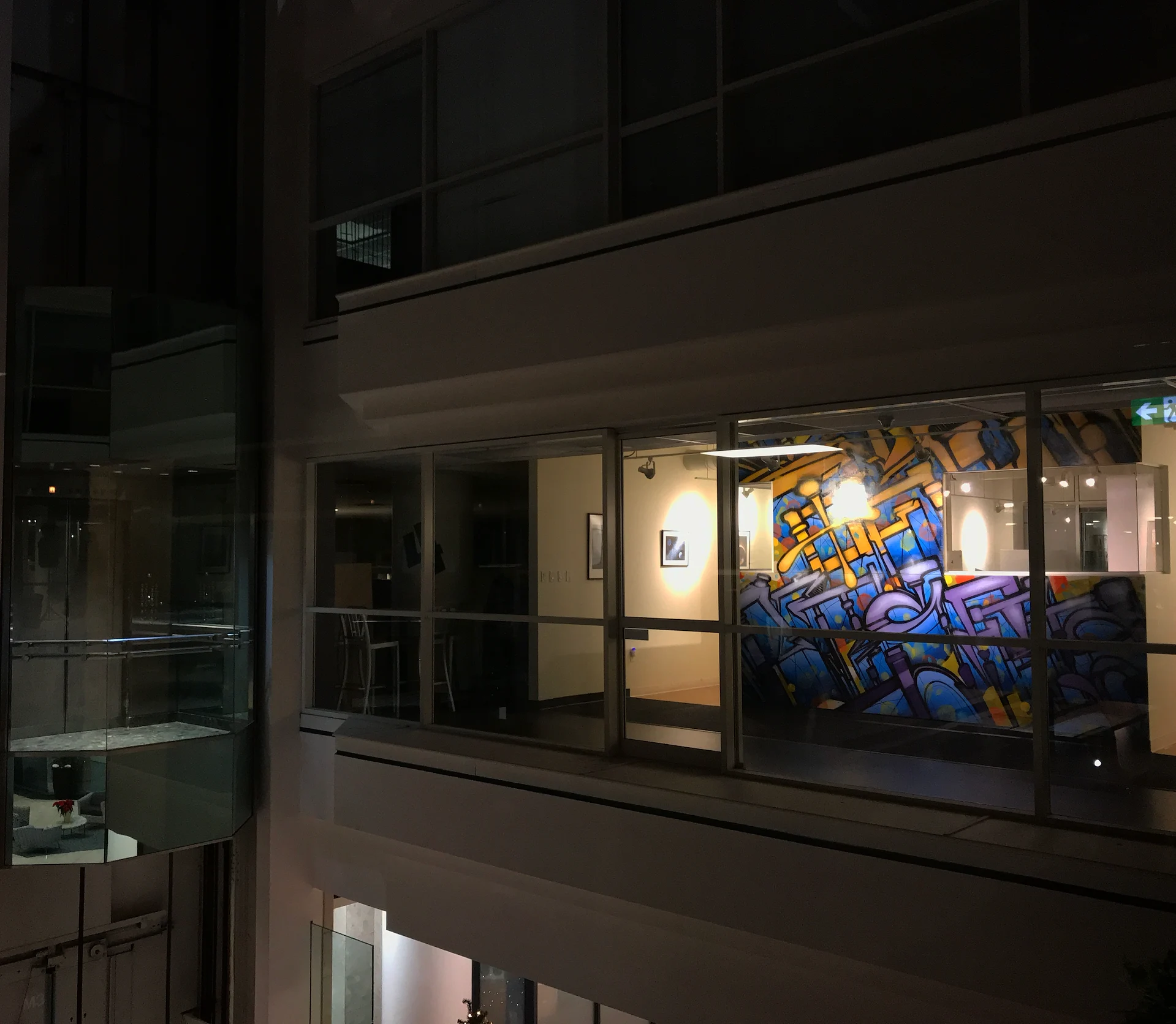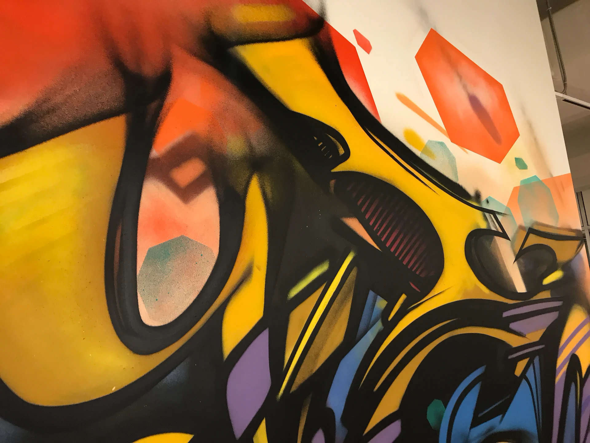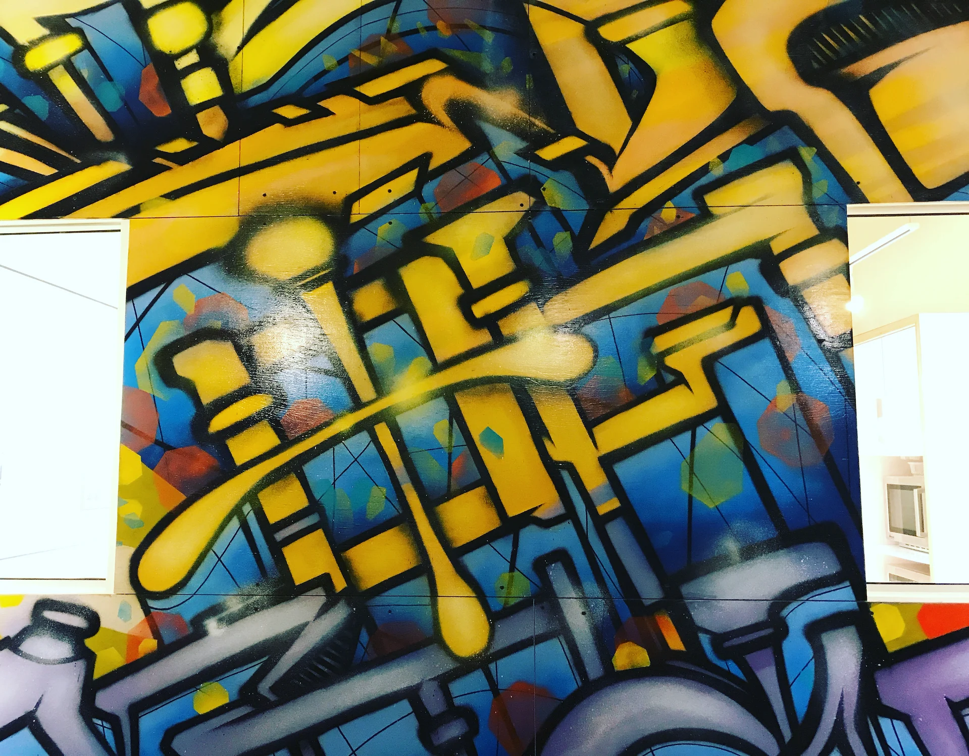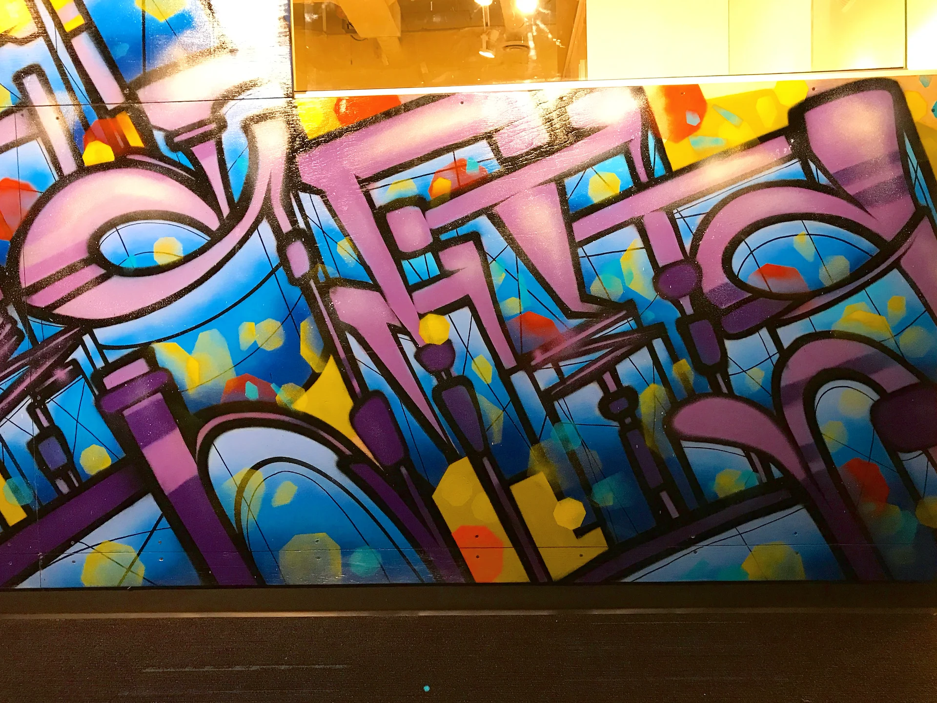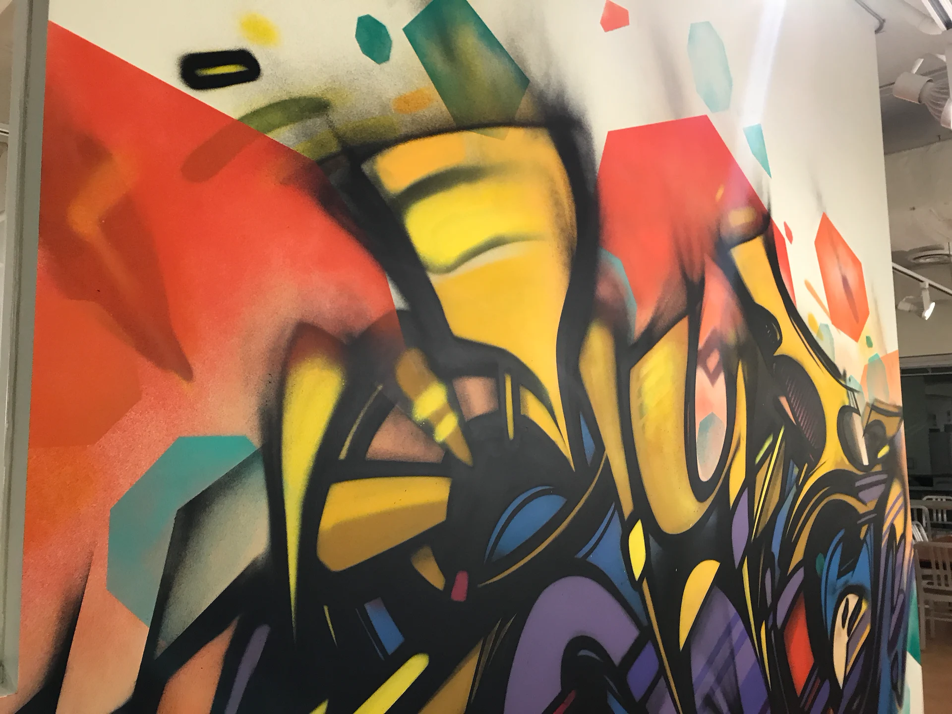 Custom art paneling was painted & installed with an urban art graffiti mural ‘Island Of Misfits’ for Industry leader animation studio IoM-Media. Creating beautiful visual value, impact, and vibrancy for the hundreds of employees that create daily. Original works of art were created and installed on lexan paneling with raised stand offs as well as a light box original painting featuring a brontosaurus in Toth’s signature ancient geometric style representing higher consciousness. Selected areas of the art are also only viewable in the spectrum of black light.