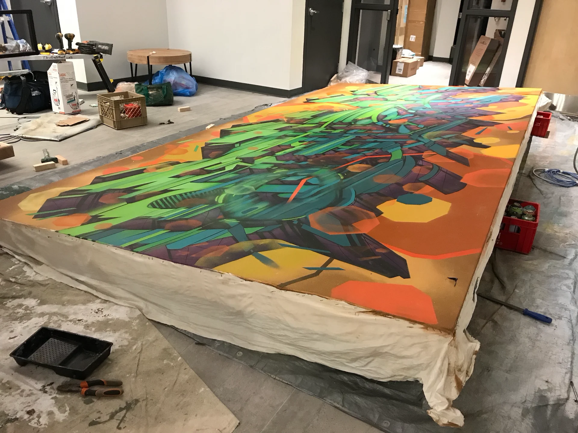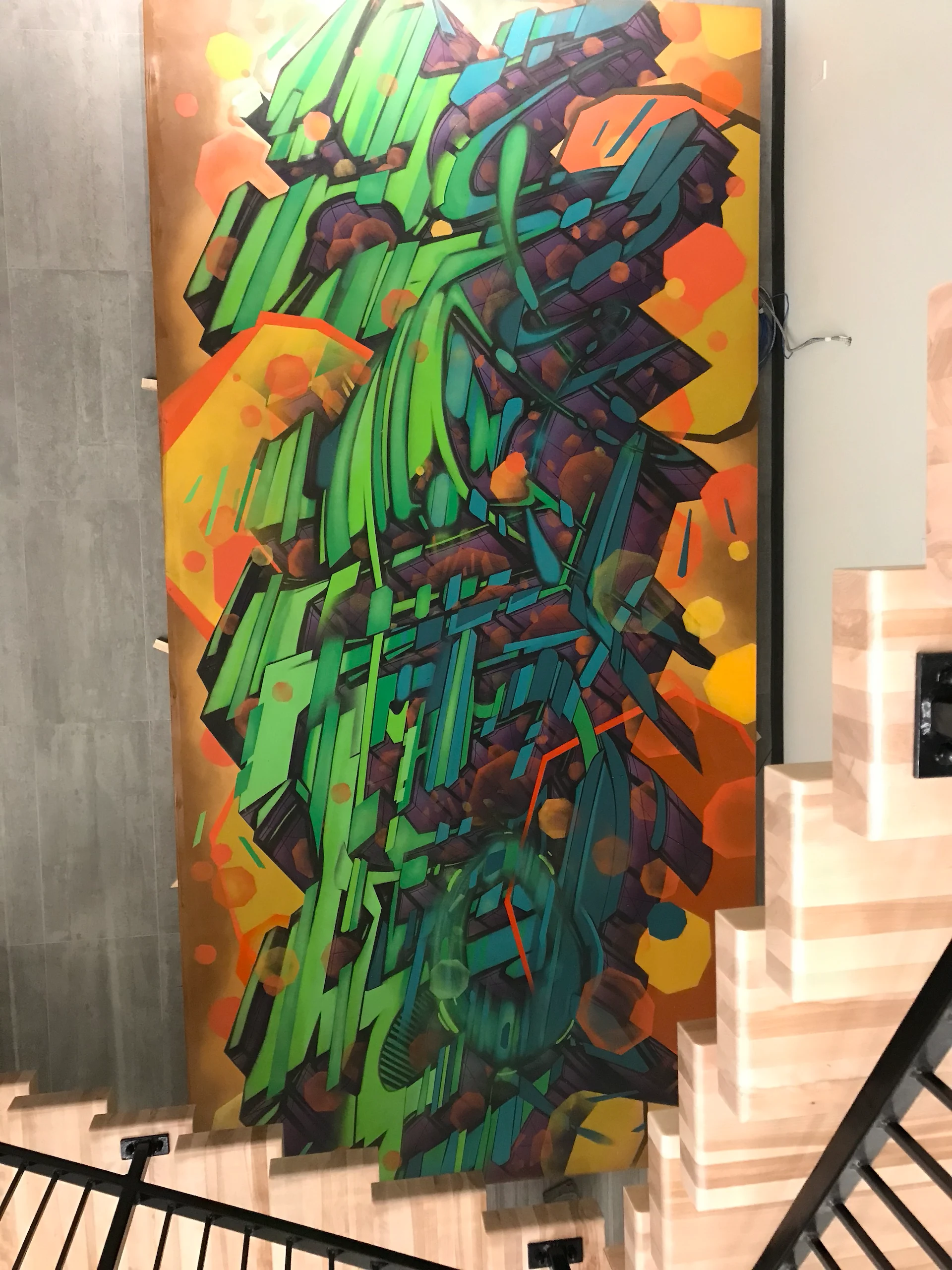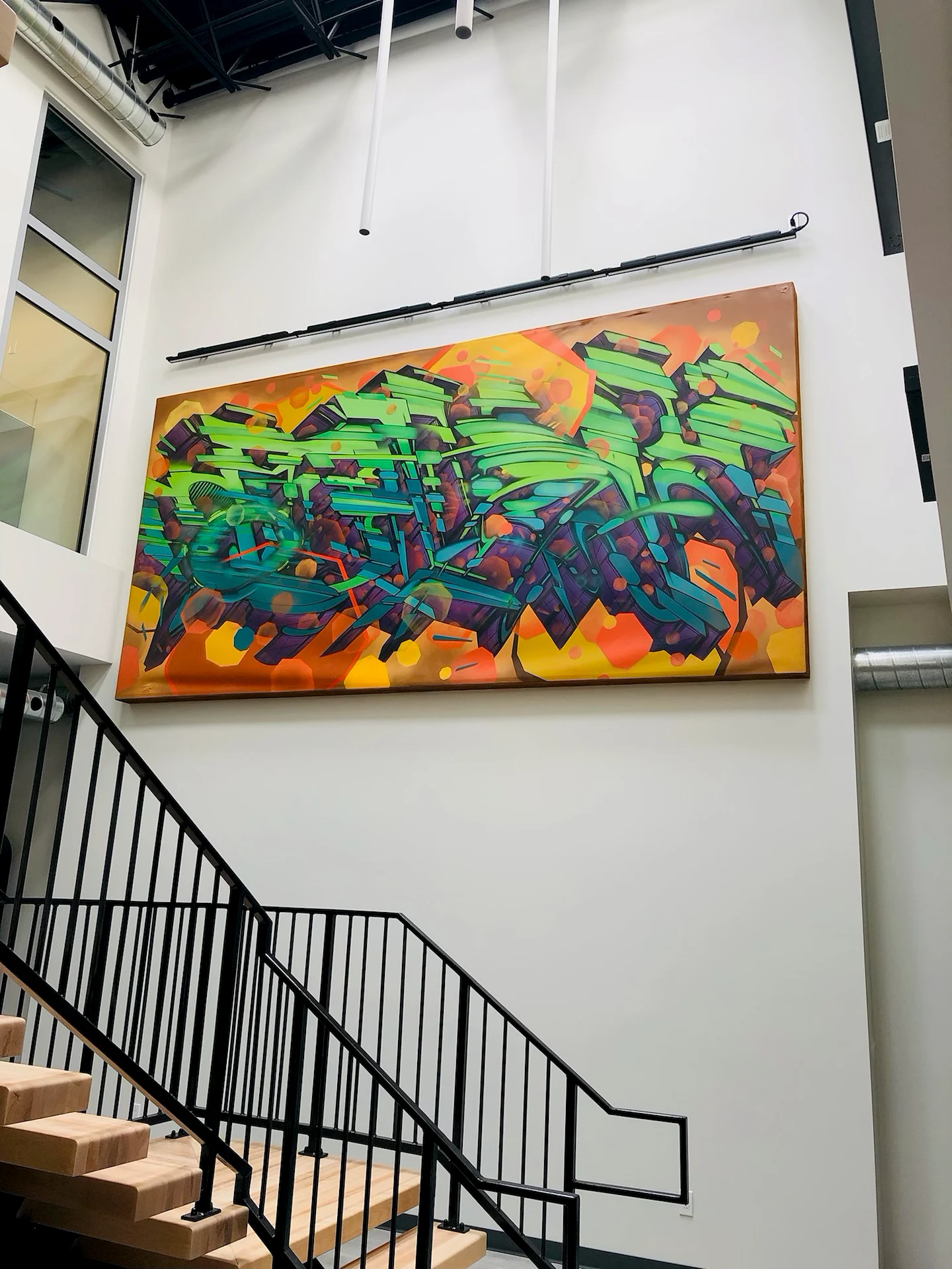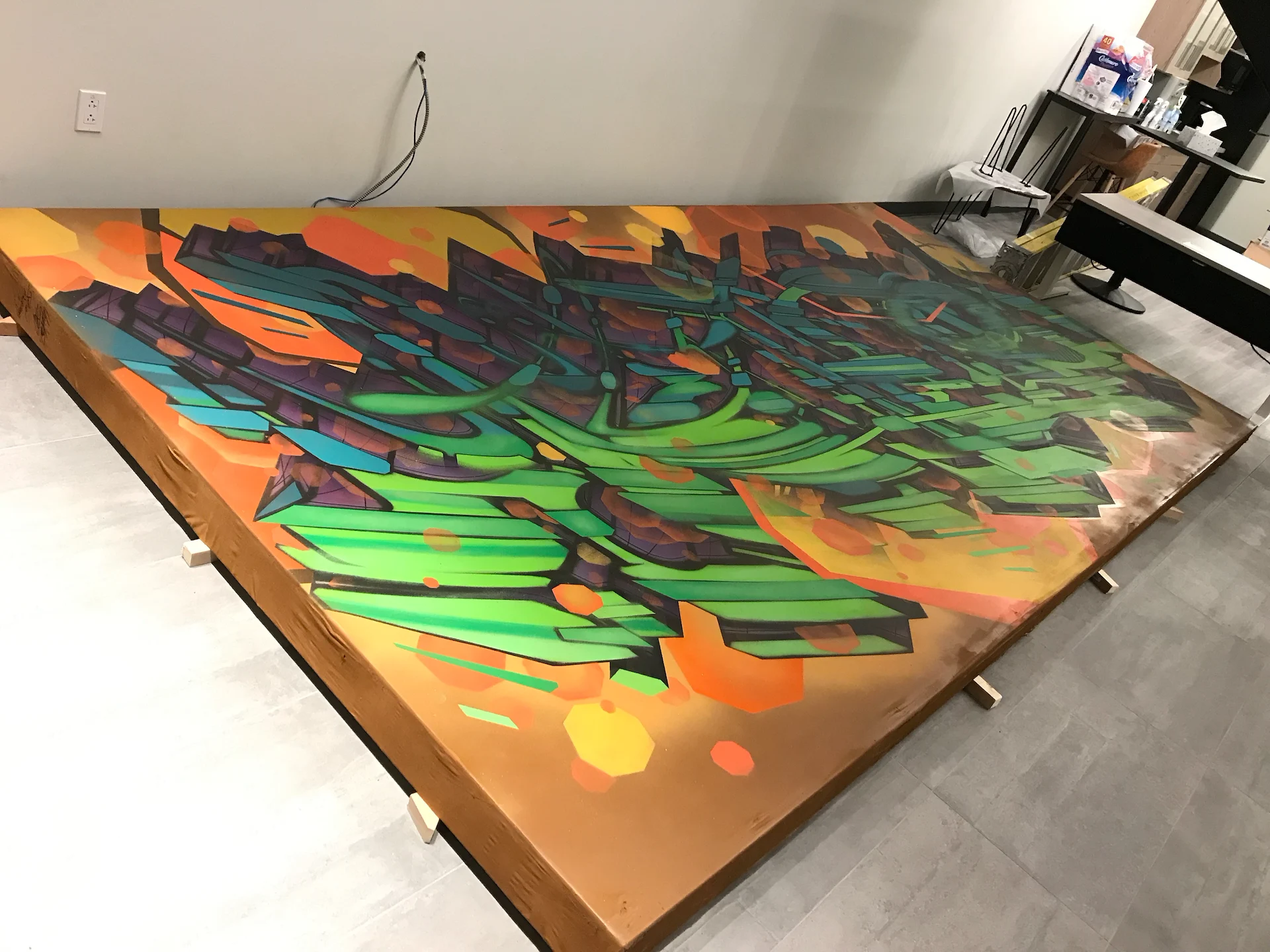 Christian Toth original painting on canvas 16ftx8ft titled ‘Justice’, and mounted on custom built frame. Head offices MacGillivray Injury & Insurance Law Moncton, New Brunswick.